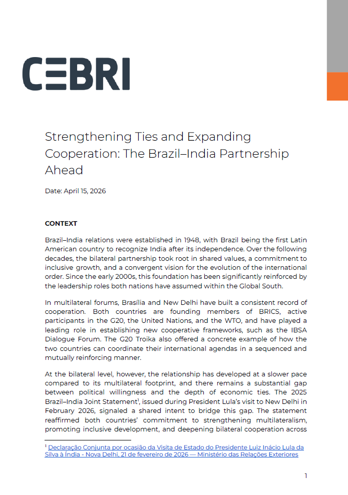 O Centro Brasileiro de Relações Internacionais (CEBRI) é um think tank independente, que contribui para a construção da agenda internacional do Brasil. Há mais de vinte anos, a instituição se dedica à promoção do debate plural e propositivo sobre o cenário internacional e a política externa brasileira.
