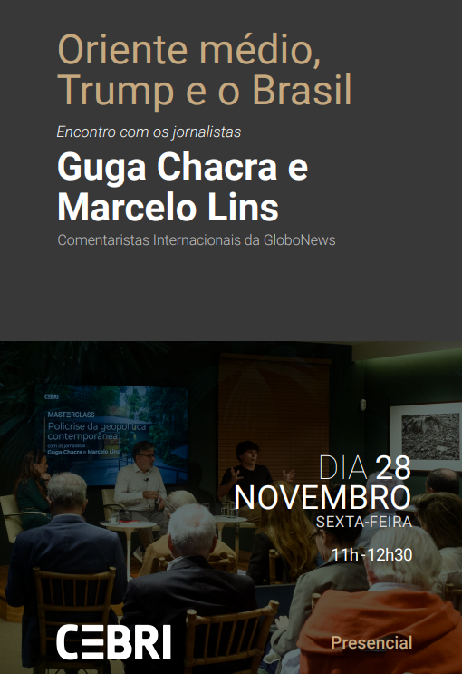 Para debater o cenário internacional atual e seus efeitos sobre o Brasil, o Centro Brasileiro de Relações Internacionais (CEBRI) promove um encontro entre os jornalistas e comentaristas da GloboNews Guga Chacra e Marcelo Lins, dia 28 de novembro, em, São Paulo.