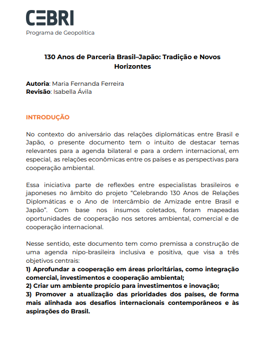 Nesse contexto, o CEBRI, em parceria com o Consulado Geral do Japão no Rio de Janeiro e com o apoio da Japan House São Paulo, realizou o Projeto "Comemorando 130 Anos de Relações Diplomáticas e o Ano de Intercâmbio de Amizade entre Brasil e Japão", com a realização de uma série de eventos on-line com especialistas renomados do Brasil e do Japão para discutir esse marco histórico e promover uma compreensão mais profunda da relação.