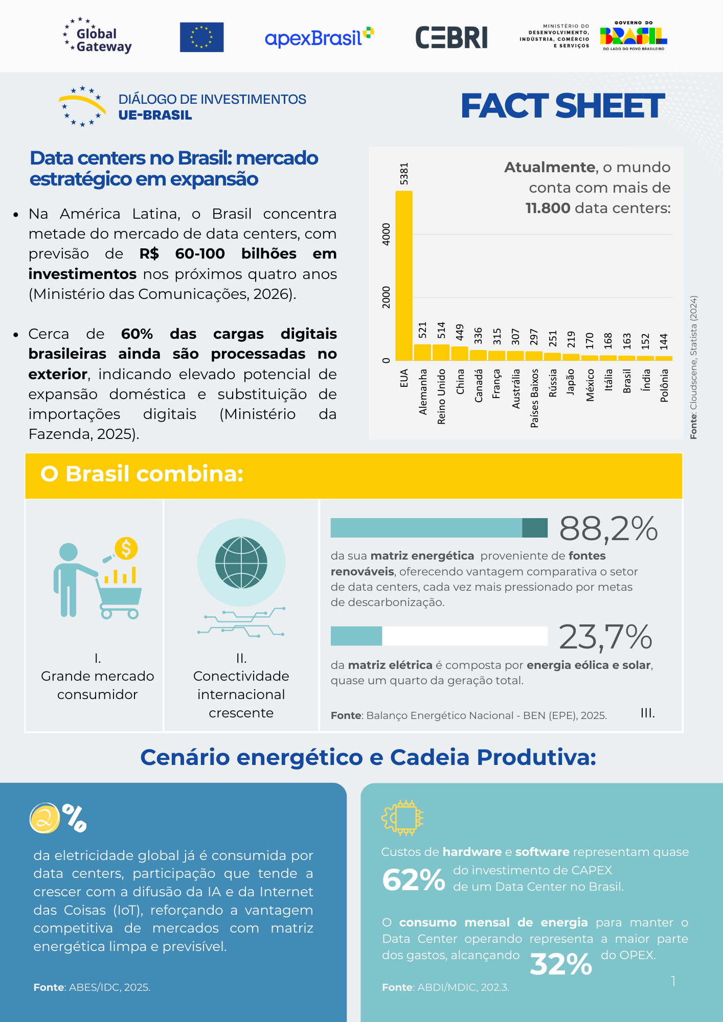 A programação teve como foco temas como infraestrutura física e digital, conectividade, energia limpa, segurança regulatória e desenvolvimento sustentável no setor de data centers. O debate buscou identificar oportunidades para novos investimentos, promover a harmonização de padrões regulatórios, estimular parcerias tecnológicas e ampliar a confiança de investidores europeus, em alinhamento com a agenda brasileira de desenvolvimento sustentável, soberania digital e transição para uma economia verde e competitiva.