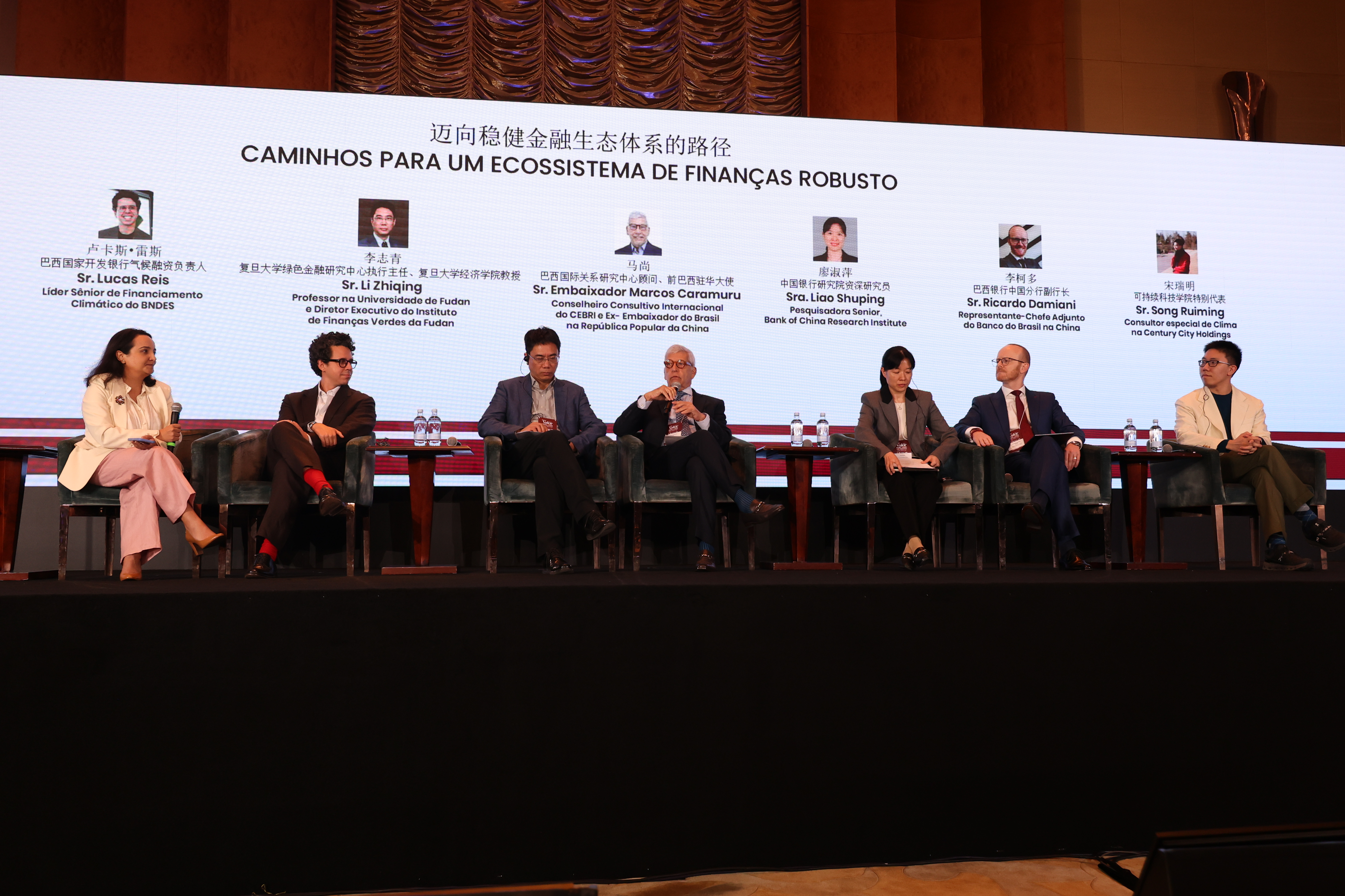Participaram também da sessão Ricardo Damiani, Representante-Chefe Adjunto do Banco do Brasil na China; Lucas Reis, Líder Sênior de Financiamento Climático do BNDES; Li Zhiqing, Diretor-Executivo do Instituto de Finanças Verdes da Universidade Fudan; Liao Shuping, Pesquisadora Sênior do Instituto de Pesquisas do Banco da China; e Song Ruiming, Consultor Especial para Clima da Century City Holdings.
