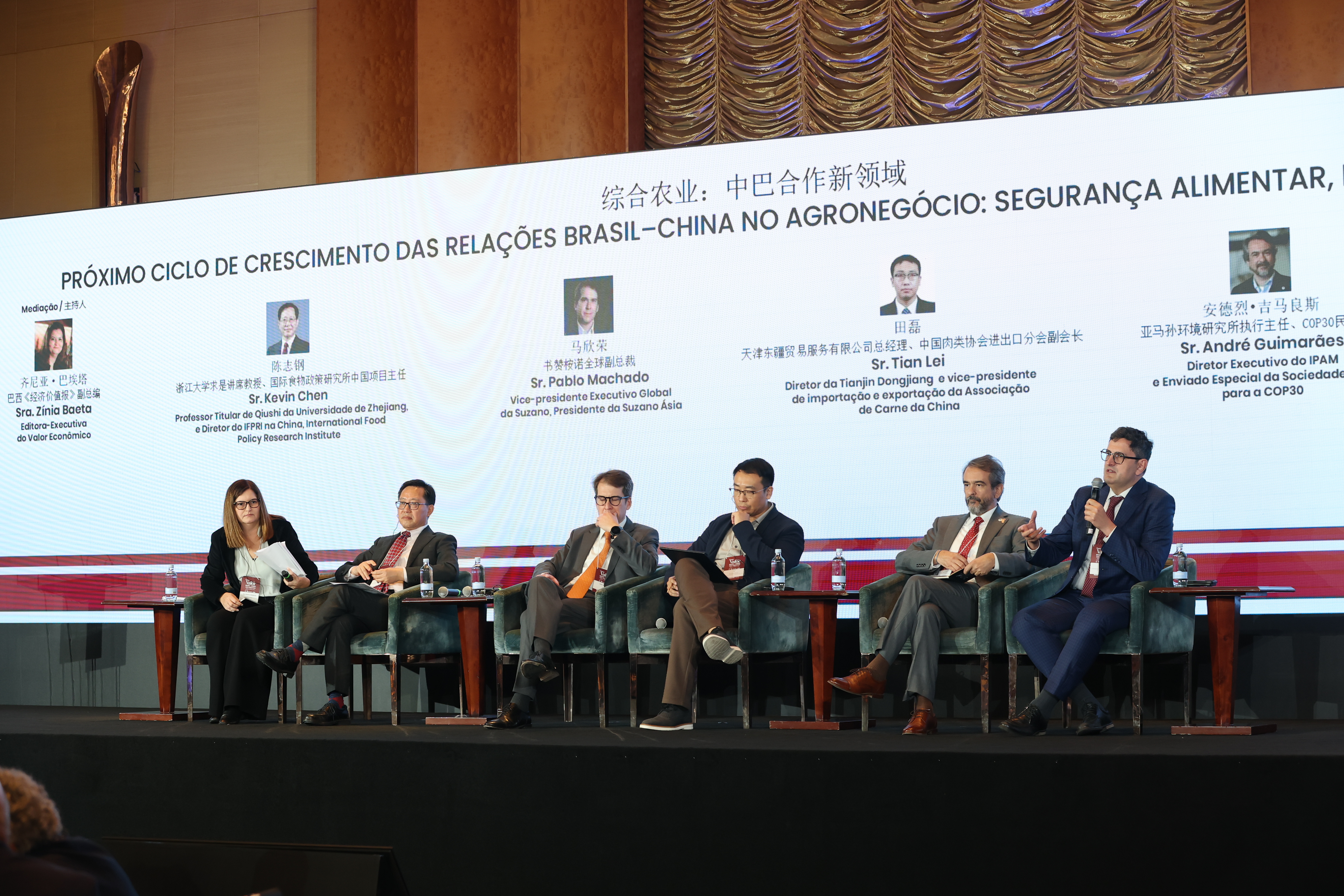 Participaram do painel Kevin Chen, Professor Titular da Universidade de Zhejiang e Diretor do IFPRI na China; Pablo Machado, VP Global da Suzano e Presidente da Suzano Ásia; Tian Lei, Diretor da Tianjin Dongjiang e VP de Importação e Exportação da Associação de Carne da China; André Guimarães, Diretor Executivo do IPAM e Enviado Especial da sociedade civil para a COP30; e Inty Mendoza, Representante-chefe da CNA/Senar na China.
