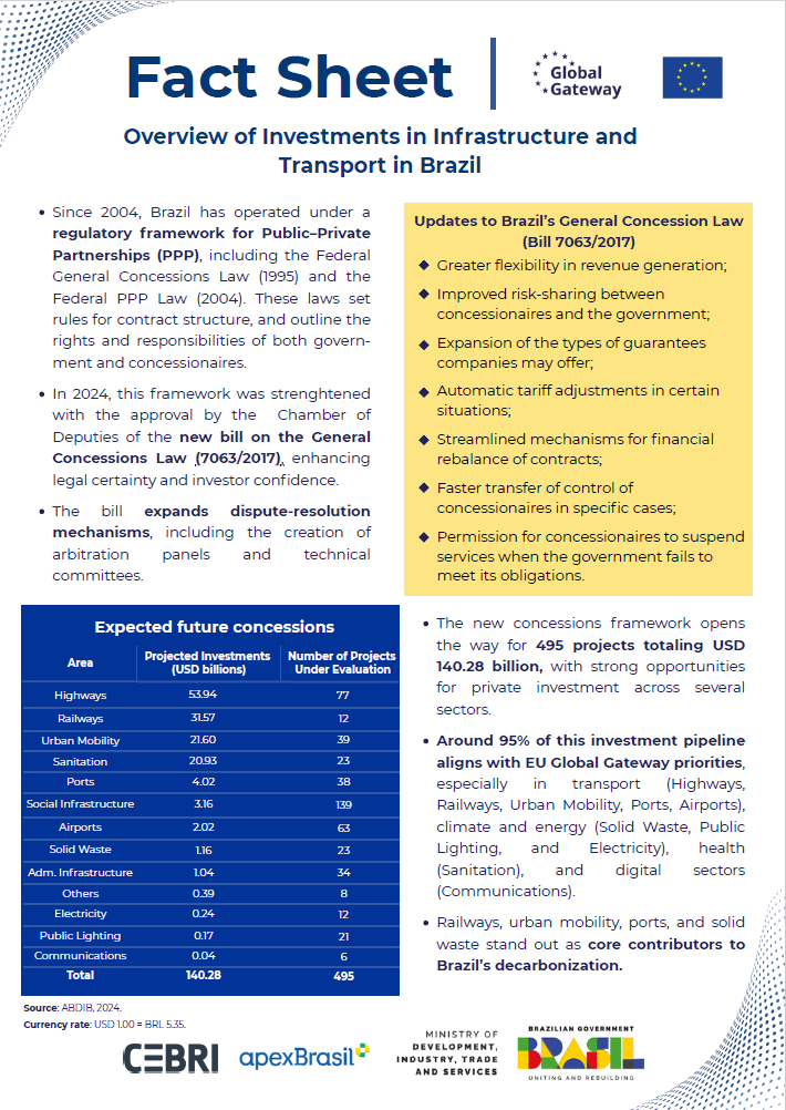 Originating from the EU–Brazil Investment Dialogue project (organized by CEBRI, ApexBrasil, and EUDEL), this factsheet provides a critical assessment of Brazil’s infrastructure pipeline and its implications for European investors and for the decarbonization agenda.