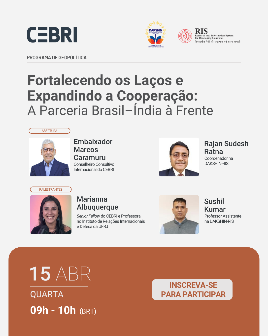 To better understand the evolving Brazil -India relations, this event will examine the trade trajectories of Brazil and India, with particular attention to the opportunities that bilateral cooperation offers for advancing their respective development agendas.
