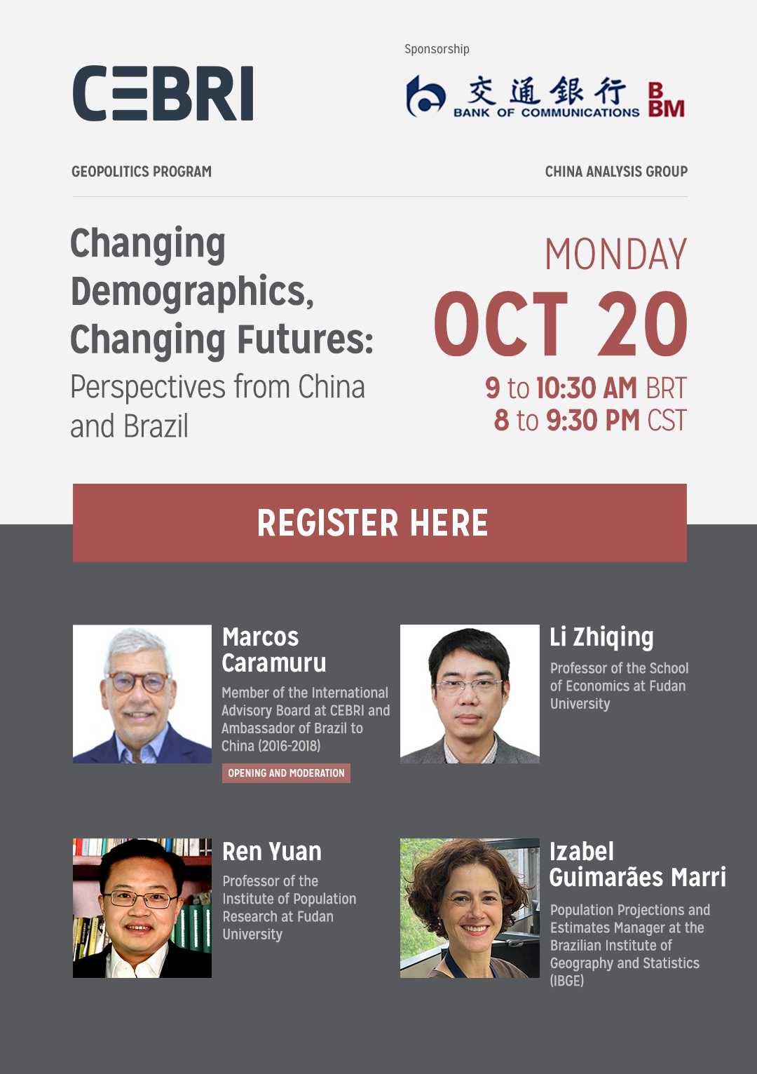China is undergoing a major demographic shift, marked since 2022 by rapid population aging and persistently low fertility rates. This dynamic offers important lessons for other emerging economies, including Brazil, which is projected to face population decline from 2041. To discuss these challenges in a comparative perspective, CEBRI’s China Analysis Group will host an online seminar bringing together experts from both countries to analyze demographic trends, their drivers, and their social, economic, and environmental implications.