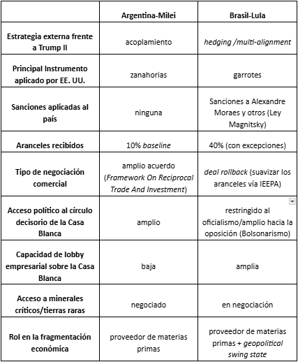 Cuadro 1: Síntesis comparativa de los gobiernos de Milei y Lula frente a Trump II