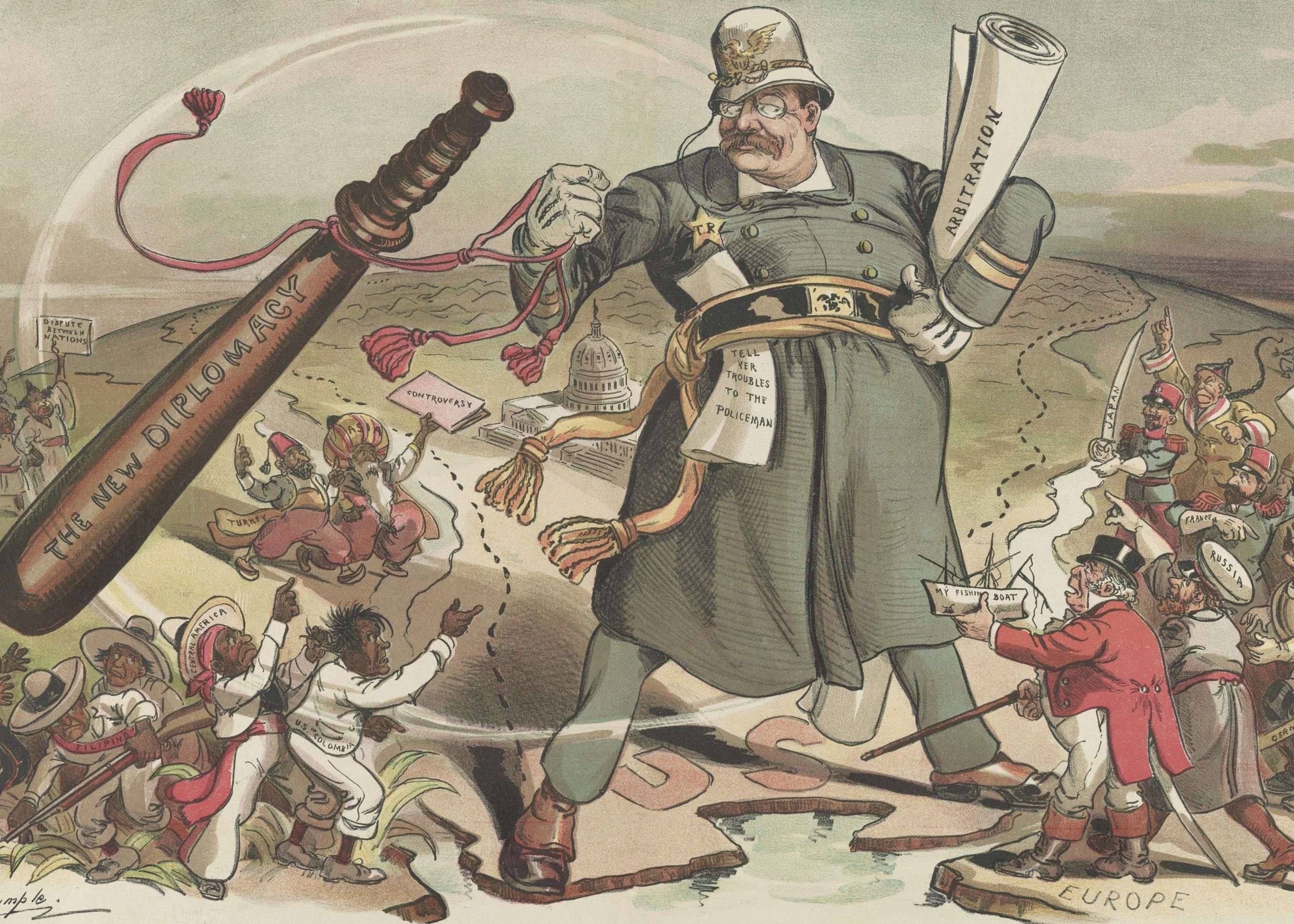 In 1897, after war had been avoided in the Venezuela/British Guiana dispute, Theodore Roosevelt had written to a friend, “In strict confidence (…) I should welcome almost any war, for I think this country needs one”. He went on to play a prominent role in the War with Spain in 1898, in which the United States established a protectorate over a newly independent Cuba and annexed Puerto Rico[2]. Roosevelt became President after the assassination of President McKinley in September 1901. In October, in his instructions to the US delegates to the second International Conference of American States to be held in Mexico City, he expressed the desire of the United States to be “the friend of all the Latin-American republics and the enemy of none”. But there were problems on the horizon. Instability and an unwillingness to honor debts in a number of countries, notably the Dominican Republic and Venezuela, were inviting intervention by European powers, including Germany, a rising economic and naval power. The Anglo-Italian-German blockade of Venezuela in 1902 led Luis Maria Drago, the foreign minister of Argentina, to propose that the American States should jointly declare that a country's failure to fulfil treaty obligations and repay its public debt did not justify military intervention or territorial occupation by a European power (sometimes called the Drago Doctrine). Roosevelt, however, had no interest in joint American declarations. The United States would unilaterally deal with hemispheric problems. In his fourth State of the Union Address to Congress on December 6th, 1904, in a passage that became known as the Roosevelt Corollary to the Monroe Doctrine, Roosevelt declared: “All that this country desires is to see the neighboring countries stable, orderly, and prosperous. Any country whose people conduct themselves well can count upon our hearty friendship. If a nation shows that it knows how to act with reasonable efficiency and decency in social and political matters, if it keeps order and pays its obligations, it need fear no interference from the United States. However, chronic wrongdoing, or an impotence which results in a general loosening of the ties of civilized society, may in America, as elsewhere, ultimately require intervention by some civilized nation, and in the Western Hemisphere the adherence of the United States to the Monroe Doctrine may force the United States, however reluctantly, in flagrant cases of such wrongdoing or impotence, to the exercise of an international police power”. In 1905 the United States intervened in the Dominican Republic to take over the customs in order to guarantee payment to foreign creditors.