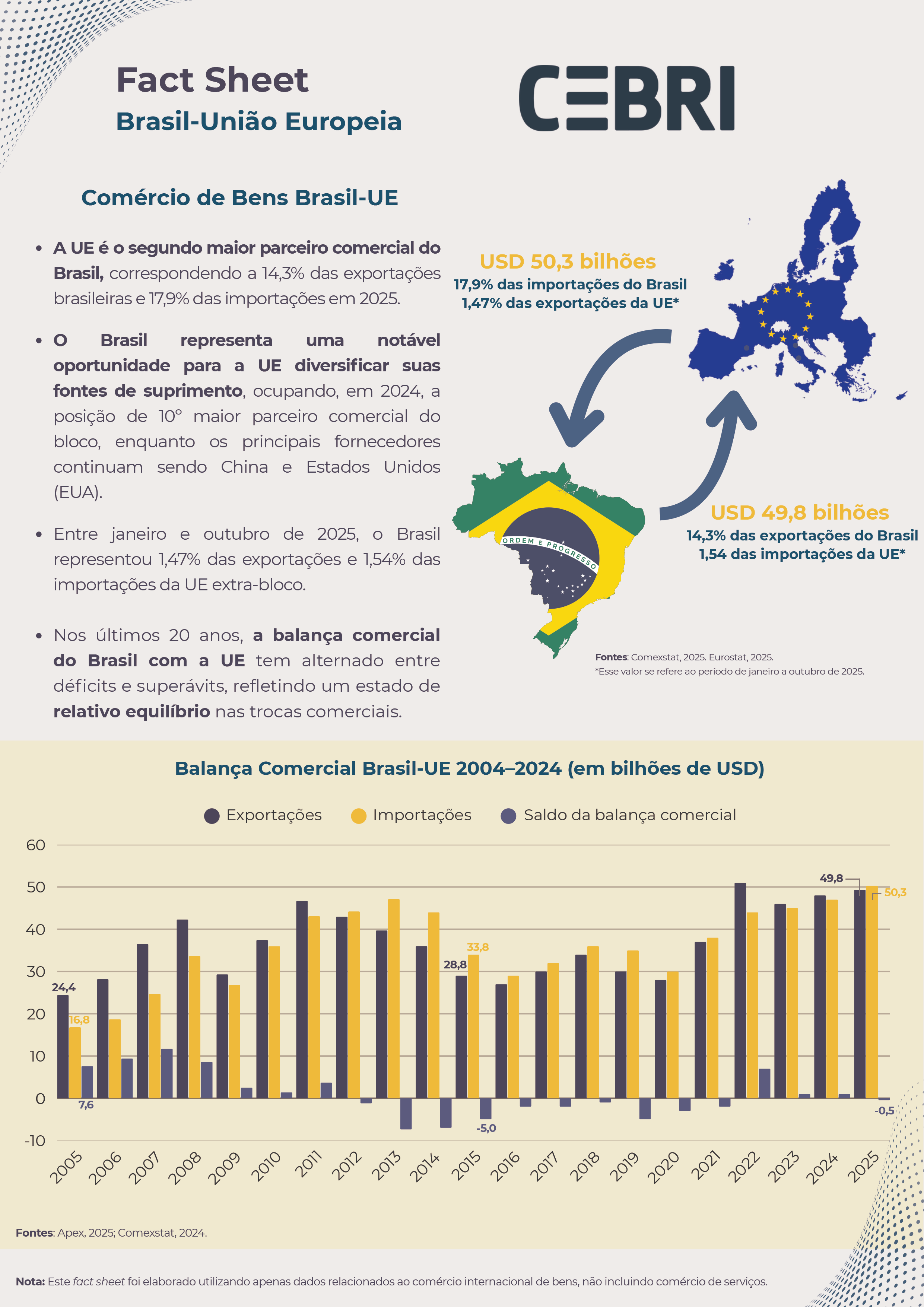 Além do levantamento de dados, o Fact Sheet é complementado por análises e comentários de Conselheiros e Senior Fellows do CEBRI, que exploram as implicações políticas, econômicas e estratégicas do acordo, bem como seus possíveis impactos de médio e longo prazo para o Brasil, a União Europeia e o sistema internacional.