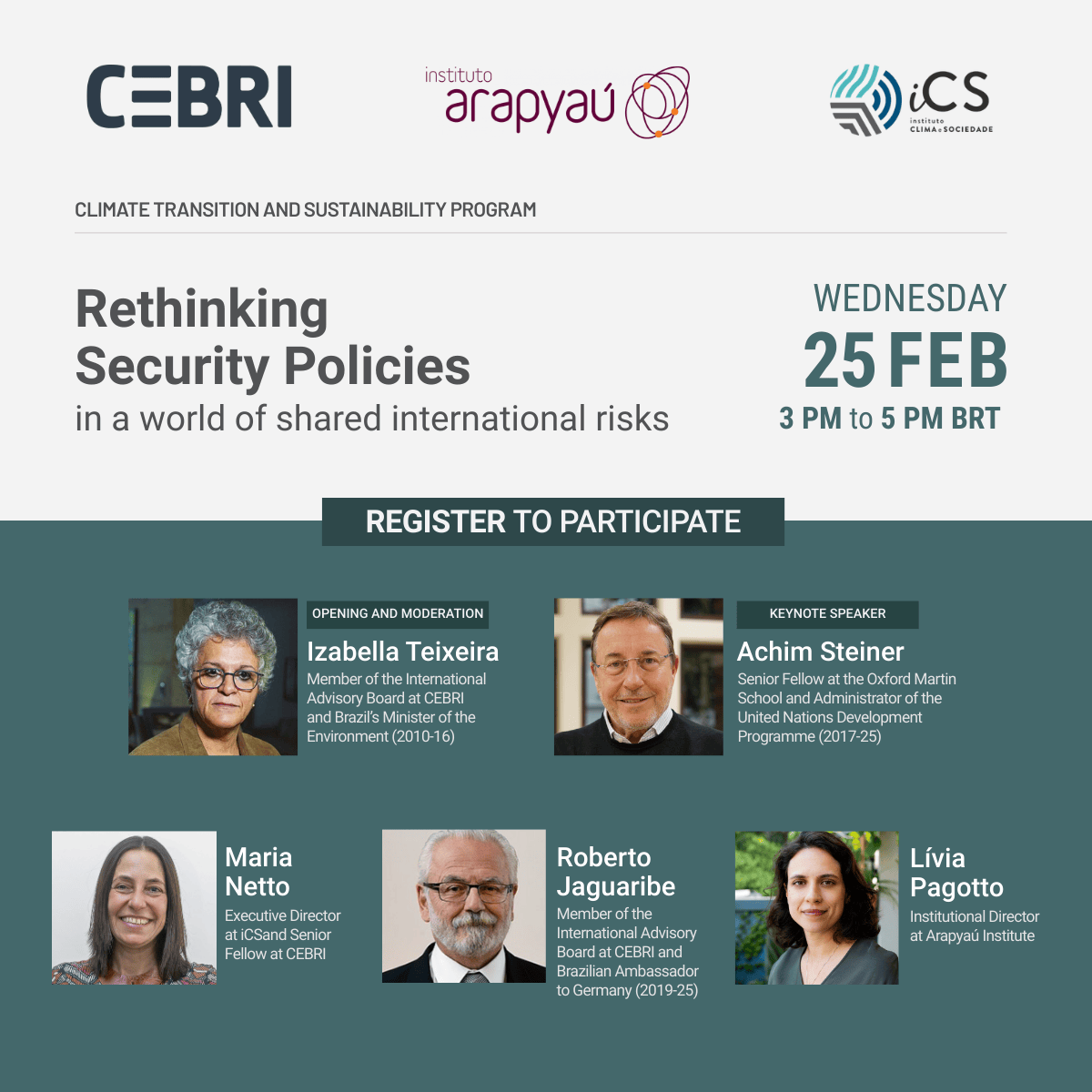 O evento tem como objetivo reformular os debates atuais sobre segurança, explorando como as mudanças climáticas, as tecnologias emergentes, as ameaças à saúde e a governança digital estão remodelando as prioridades de segurança nacional e internacional. A discussão promoverá um diálogo entre a academia, formuladores de políticas públicas, líderes do setor privado e representantes da sociedade civil, com o objetivo de incentivar abordagens resilientes e cooperativas para a segurança. O debate buscará ir além dos paradigmas tradicionais de defesa, em direção a estratégias que enfrentem desafios sistêmicos e interconectados.