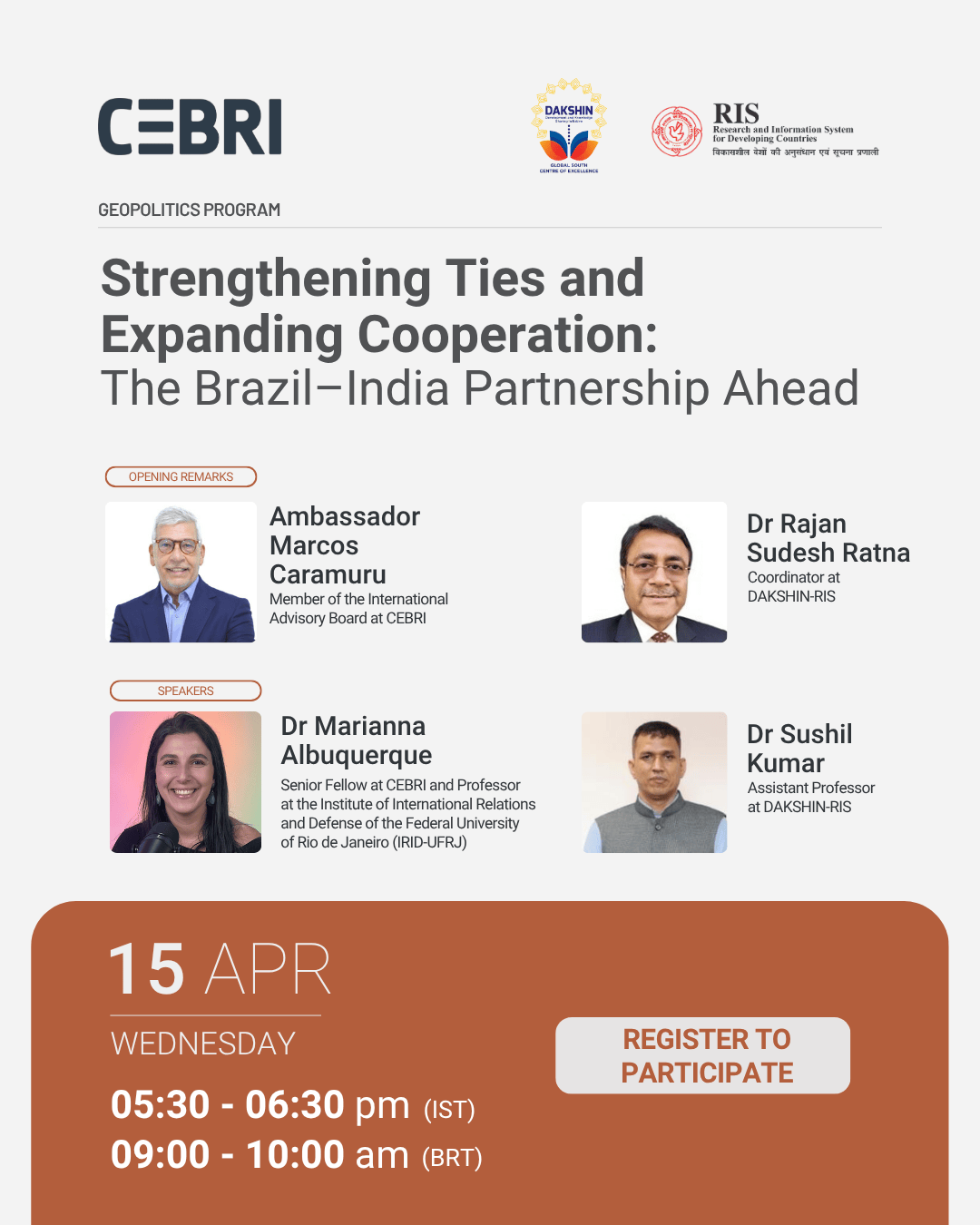 To better understand the evolving Brazil -India relations, this event will examine the trade trajectories of Brazil and India, with particular attention to the opportunities that bilateral cooperation offers for advancing their respective development agendas.